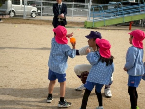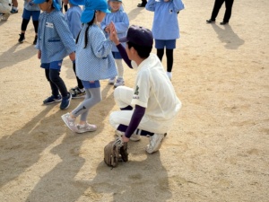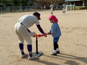 野球振興を目的に、園児の皆さんに野球を身近に感じてもらおうと、おにごっこ、キャッチボール、ティー台野球を野球部員と一緒に行いました。当日は、年長クラスの園児の皆さんと交流しましたが、園児の皆さんの笑顔や歓声に元気をいただく時間となりました。