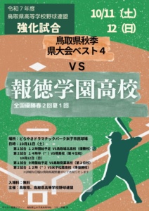 10月11日(土)、12日(日)にどらドラパーク米子市民球場において、報徳学園高校(兵庫)を招待した強化試合が行われます。本校の試合は、12日(日)12時試合開始予定です。入場料は無料ですので、ぜひご観戦ください。