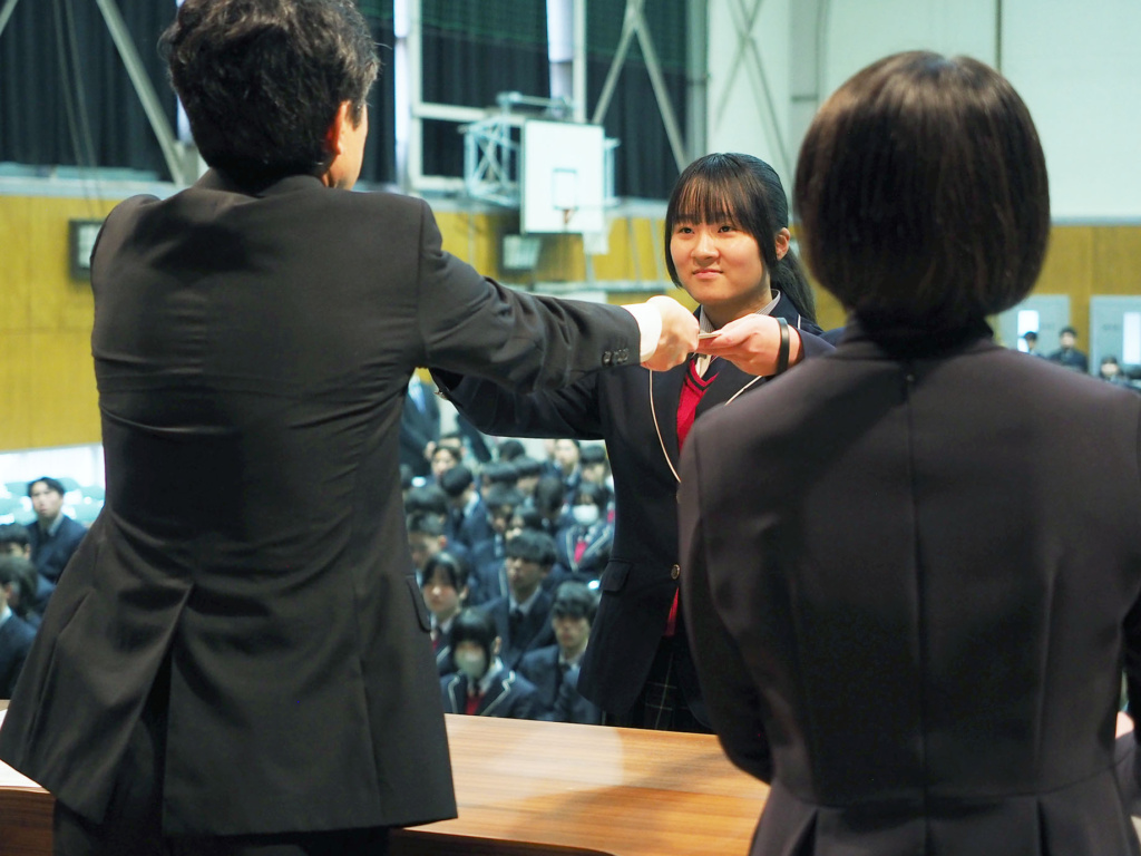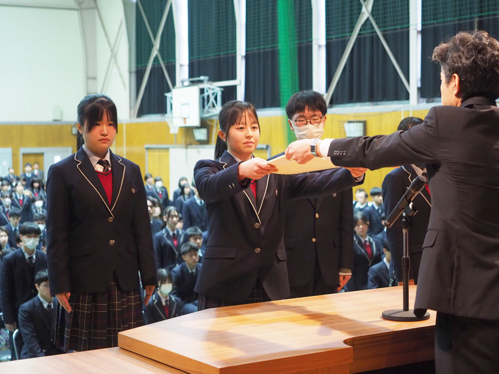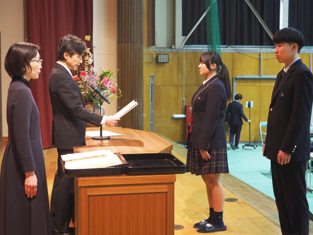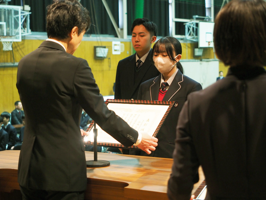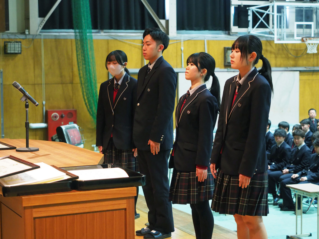 卒業を控えた3年生の3年間の功績や、1年生から3年生まで1年間の部活動における功績などが全校生徒の前で表彰されました。