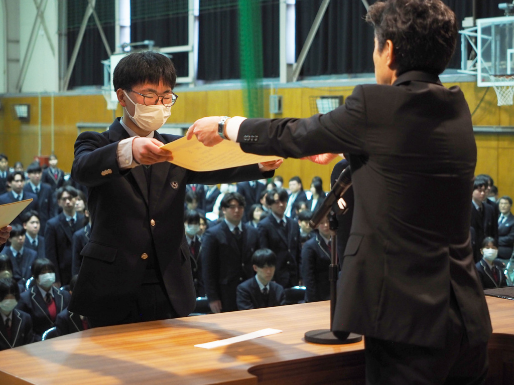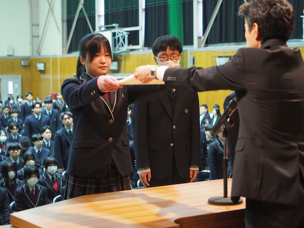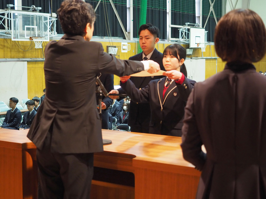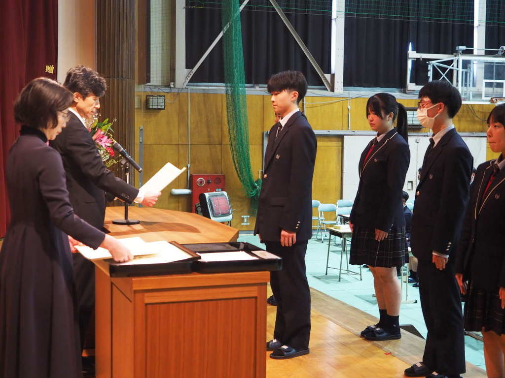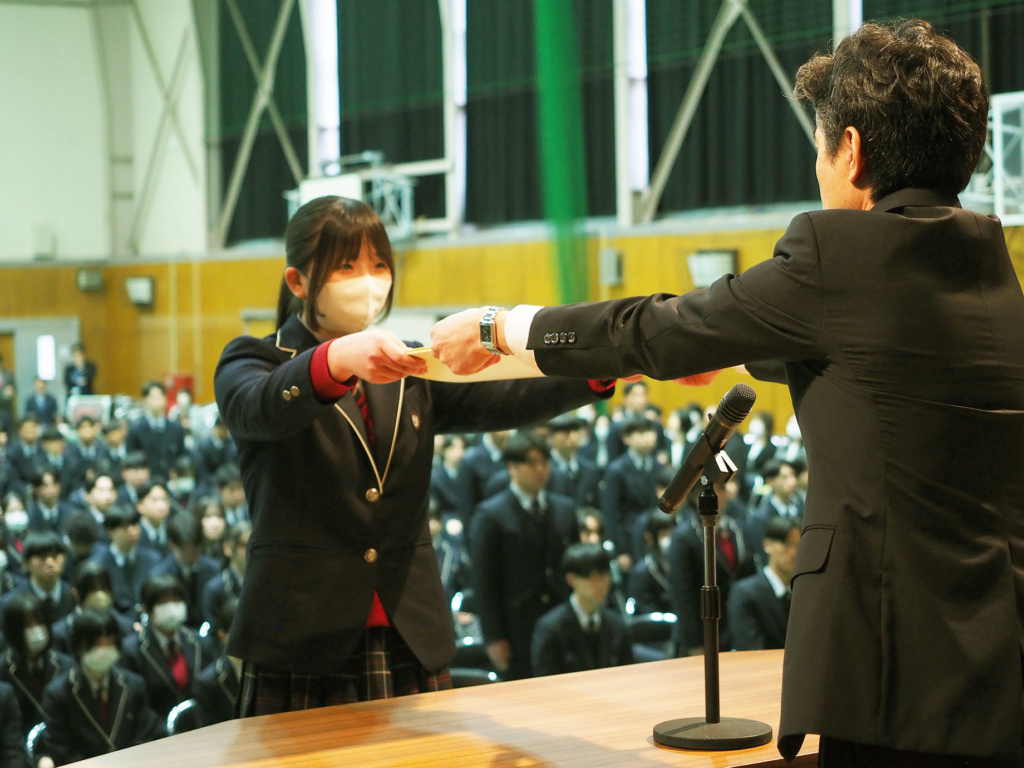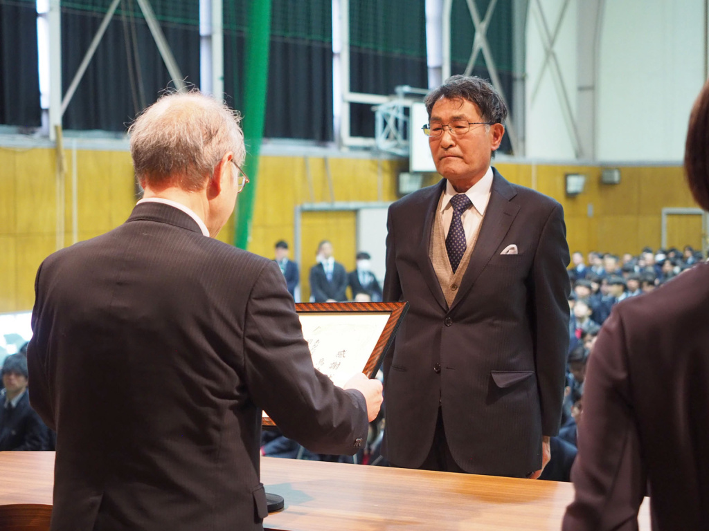 卒業を控えた3年生の3年間の功績や、1年生から3年生まで1年間の部活動における功績などが全校生徒の前で表彰されました。
