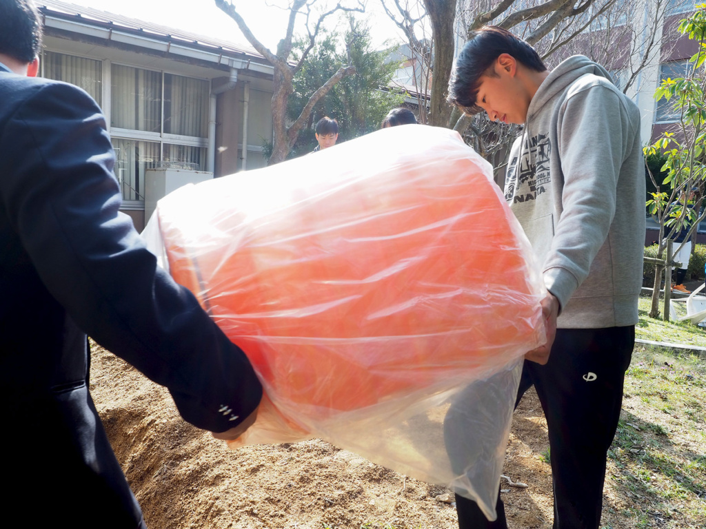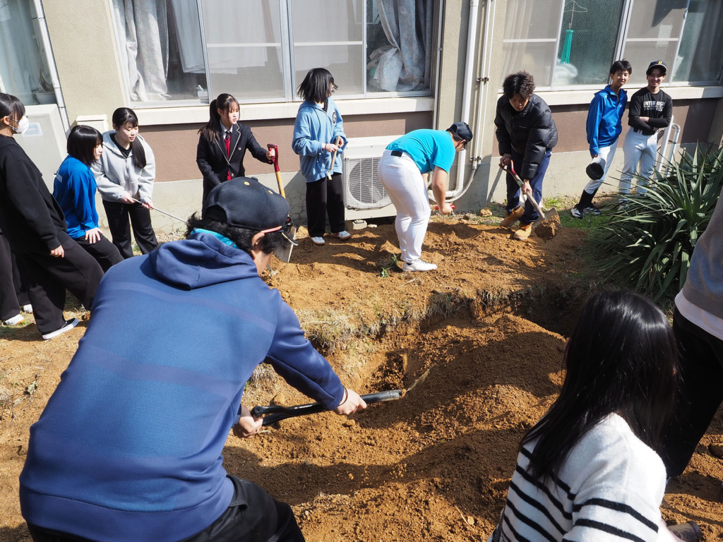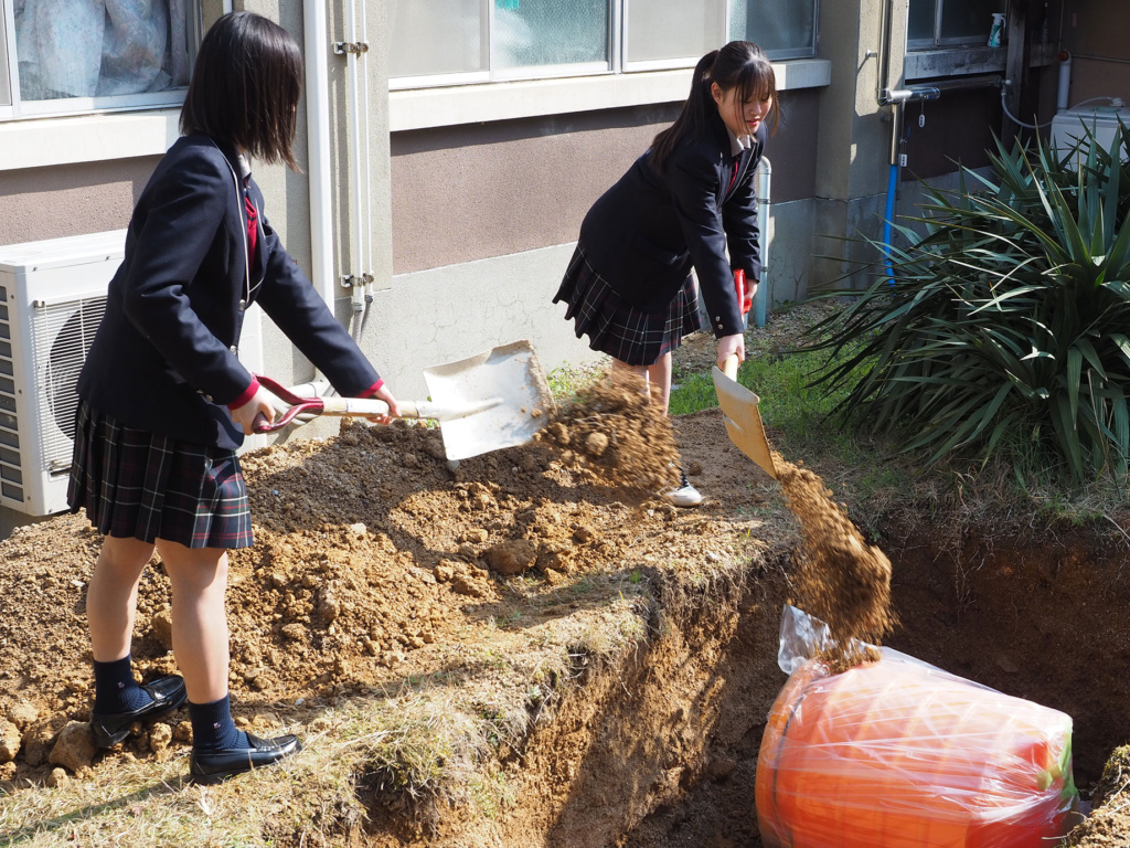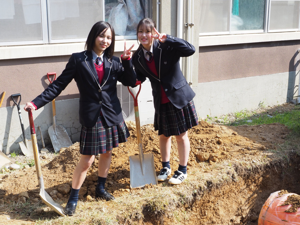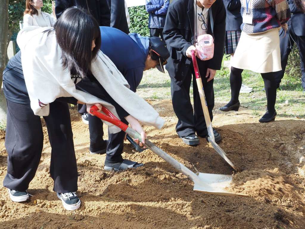 たくさんの生徒と卒業生に見守られ、タイムカプセルは無事に埋められました。