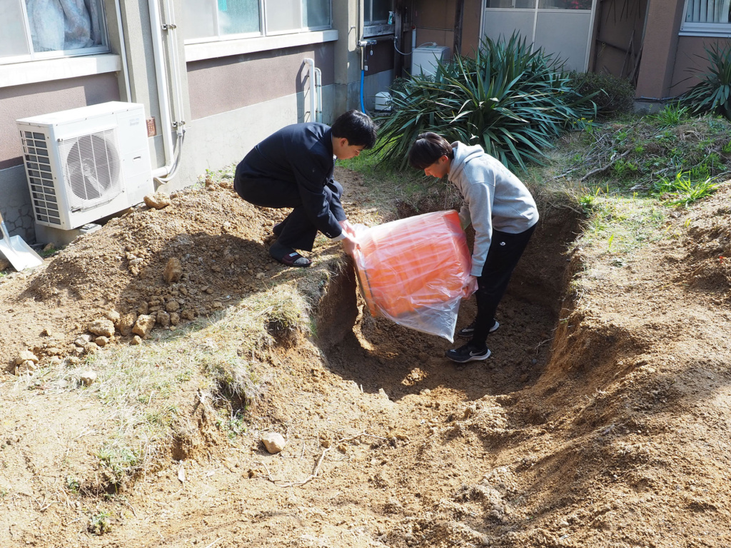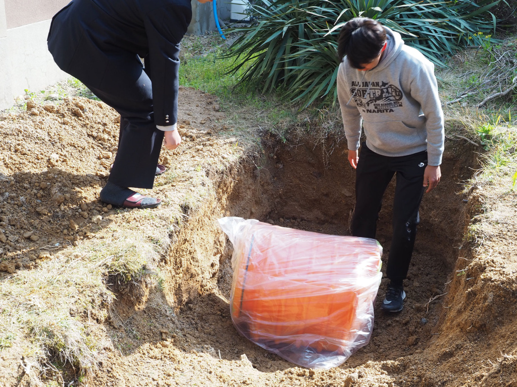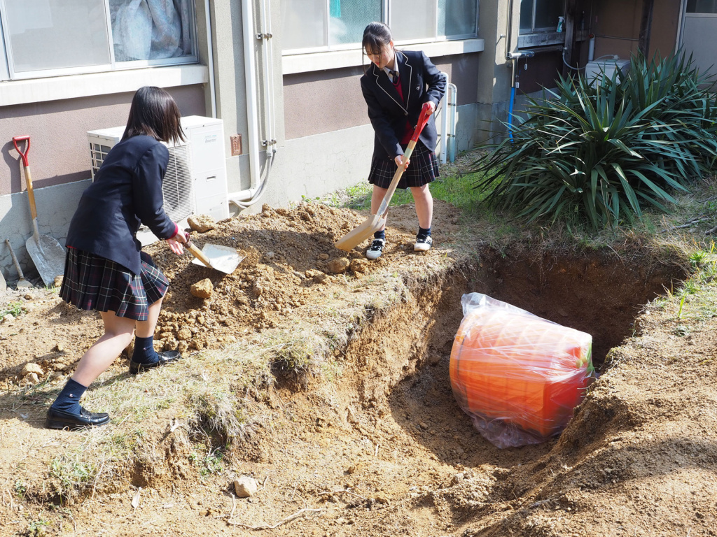 3月27日(金)、70周年記念事業として準備してきたタイムカプセルを学校の中庭に埋めるイベントを行いました。