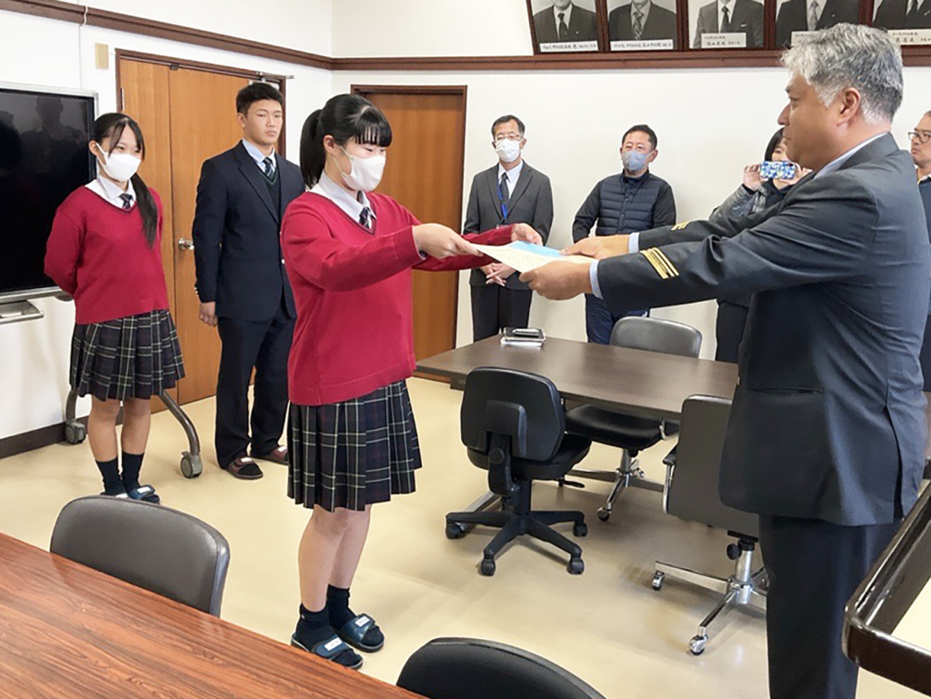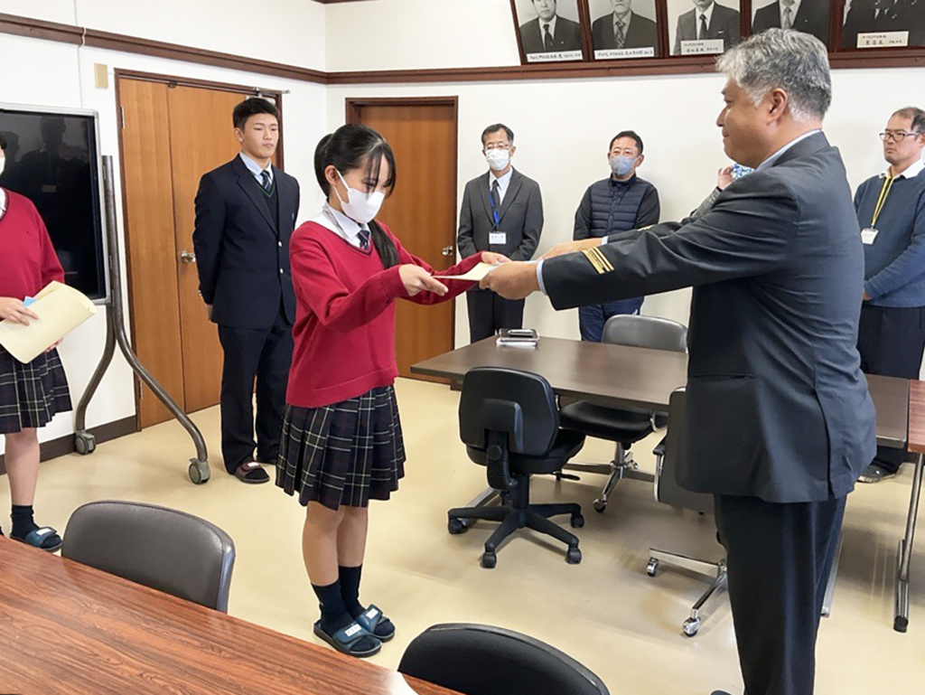 その善行に対して、米子駅駅長様、副駅長様をはじめJR職員の方に来校いただき、直接感謝状を渡していただきました。